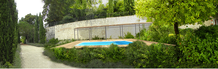 En retrait par rapport aux chambres pour ne pas troubler la tranquillité des hôtes, son exposition plein sud lui permettra de bénéficier du soleil toute la journée et de profiter de la vue entièrement dégagée sur la vallée depuis le bassin et ses plages.